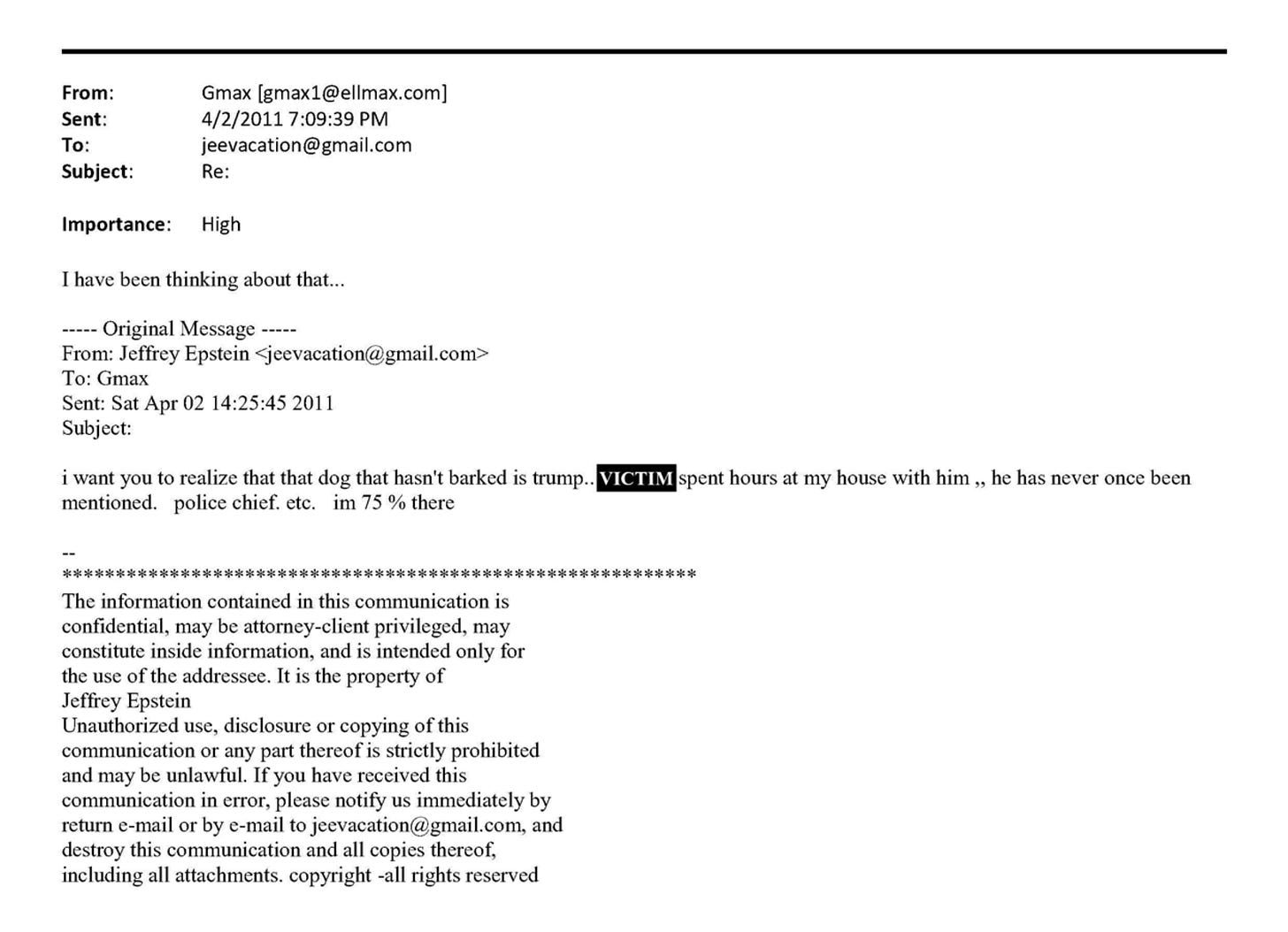 “I want you to realize that that dog that hasn’t barked is trump,” Jeffrey Epstein wrote in an email to Ghislaine Maxwell on April 2, 2011.