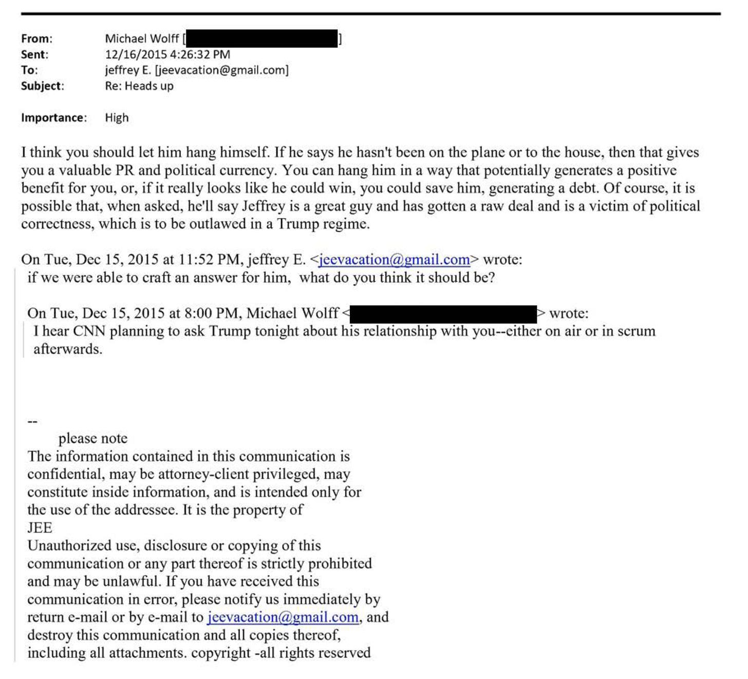 Finally, in a third never-before-seen email from December 15-16, 2015, Epstein and Wolff discuss how Trump might respond to questions about their relationship during the 2015-2016 campaign.