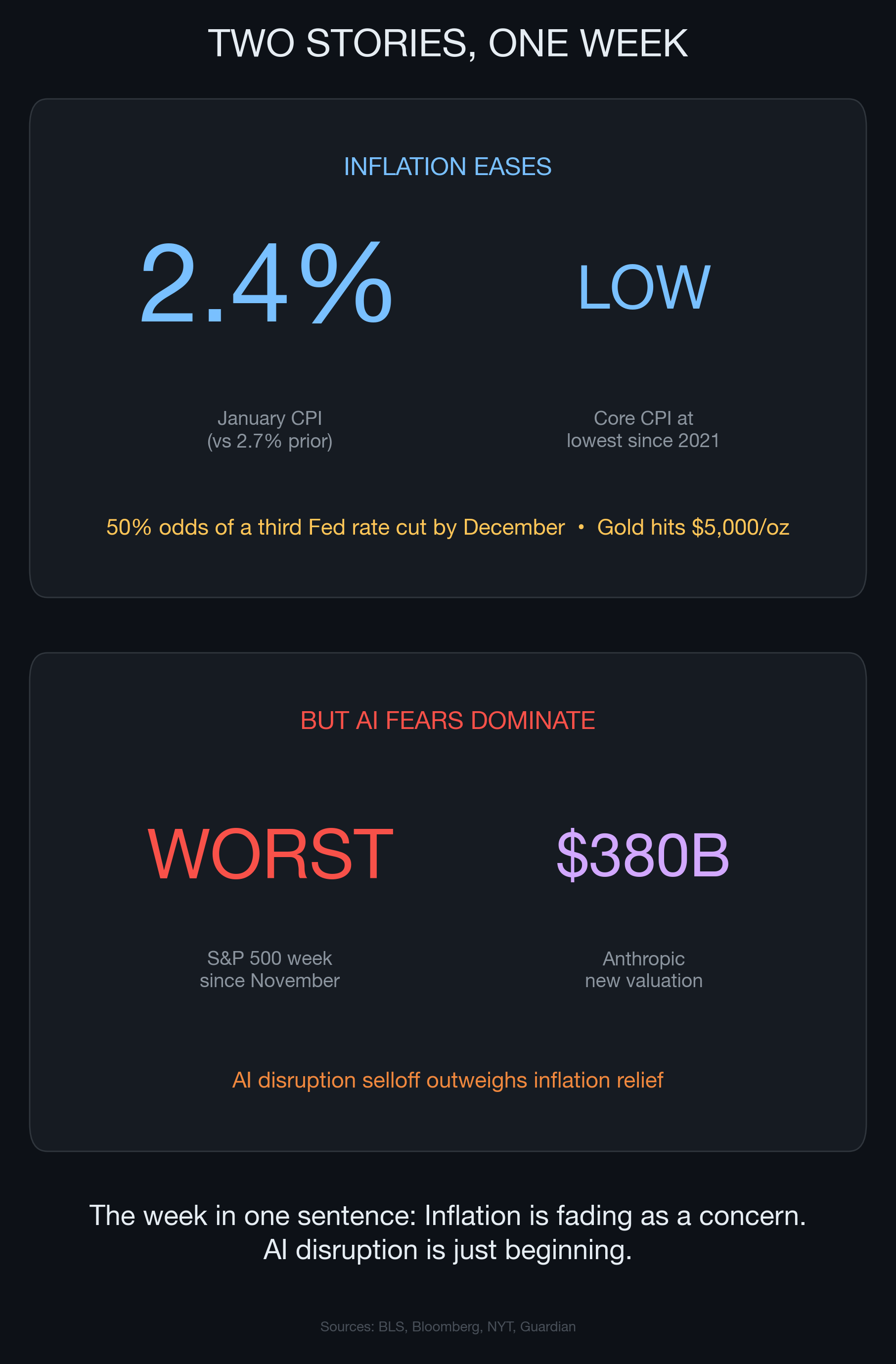 January CPI came in at 2.4 percent — below the 2.5 percent economists expected and down from December’s 2.7 percent. Core inflation fell to its lowest annual rate since 2021. Bond yields dropped and traders now price roughly 50 percent odds of a third Fed rate cut by December, up from earlier this week. Gold hit $5,000 an ounce for the first time. New York Times Bloomberg Guardian