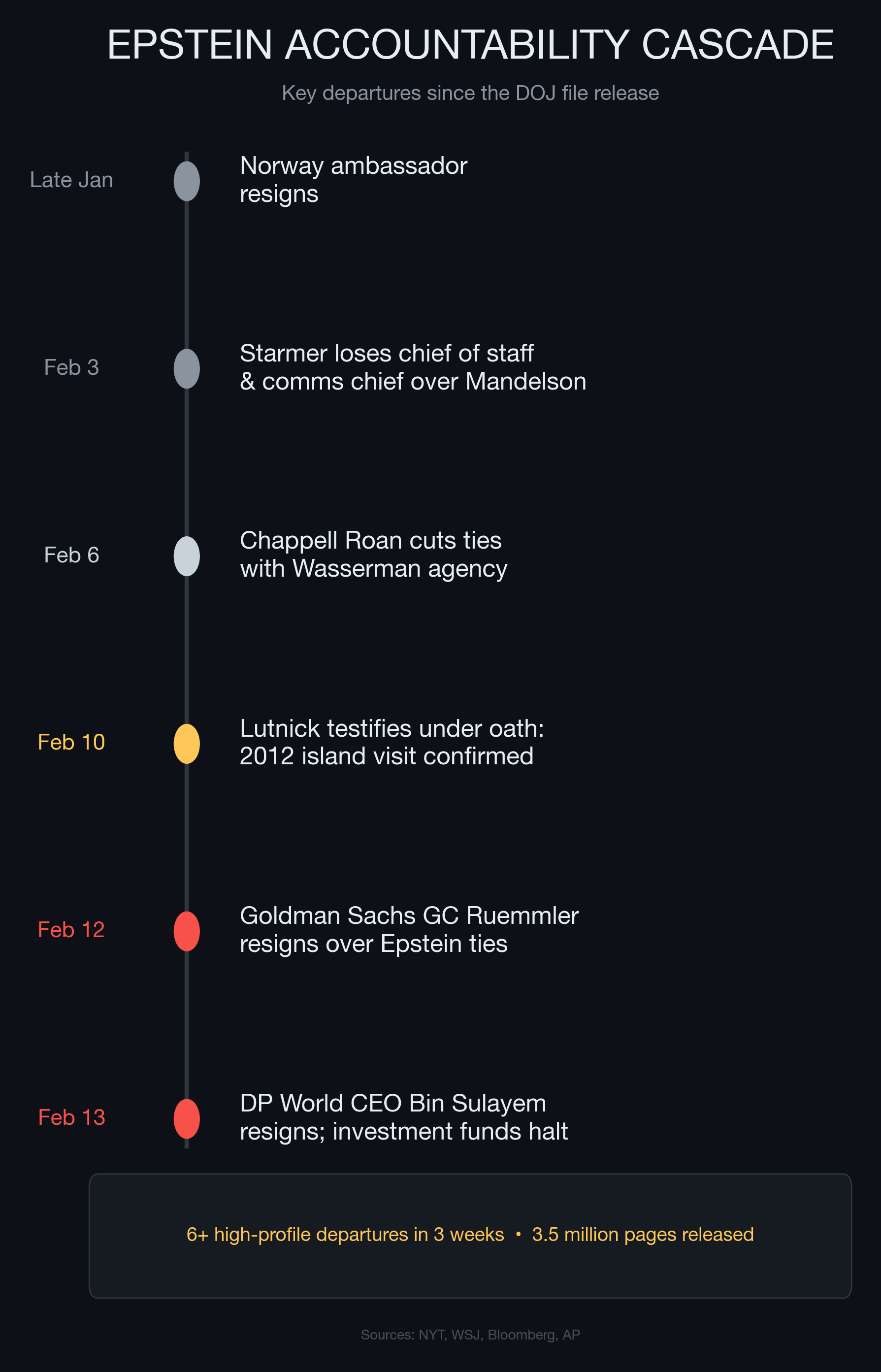 The Epstein files claimed two of their most prominent casualties Thursday and Friday: Goldman Sachs general counsel Kathryn Ruemmler, who Goldman had defended for months and and Sultan Ahmed bin Sulayem, who resigned as CEO and chairman of DP World, one of the world’s largest logistics companies, after Bloomberg revealed he maintained a relationship with Epstein for more than a decade after Epstein’s 2008 conviction. WSJ Bloomberg