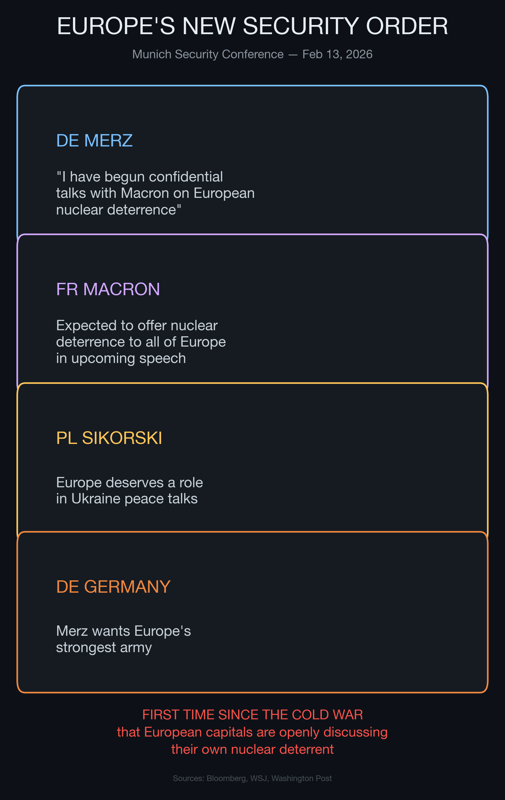 For the first time since the end of the Cold War, European capitals are openly discussing how to develop their own nuclear deterrent. German Chancellor Friedrich Merz confirmed it at the Munich Security Conference on Friday: “I have begun confidential talks with the French president on European nuclear deterrence. We will not allow zones of differing security to emerge in Europe.” Bloomberg Bloomberg