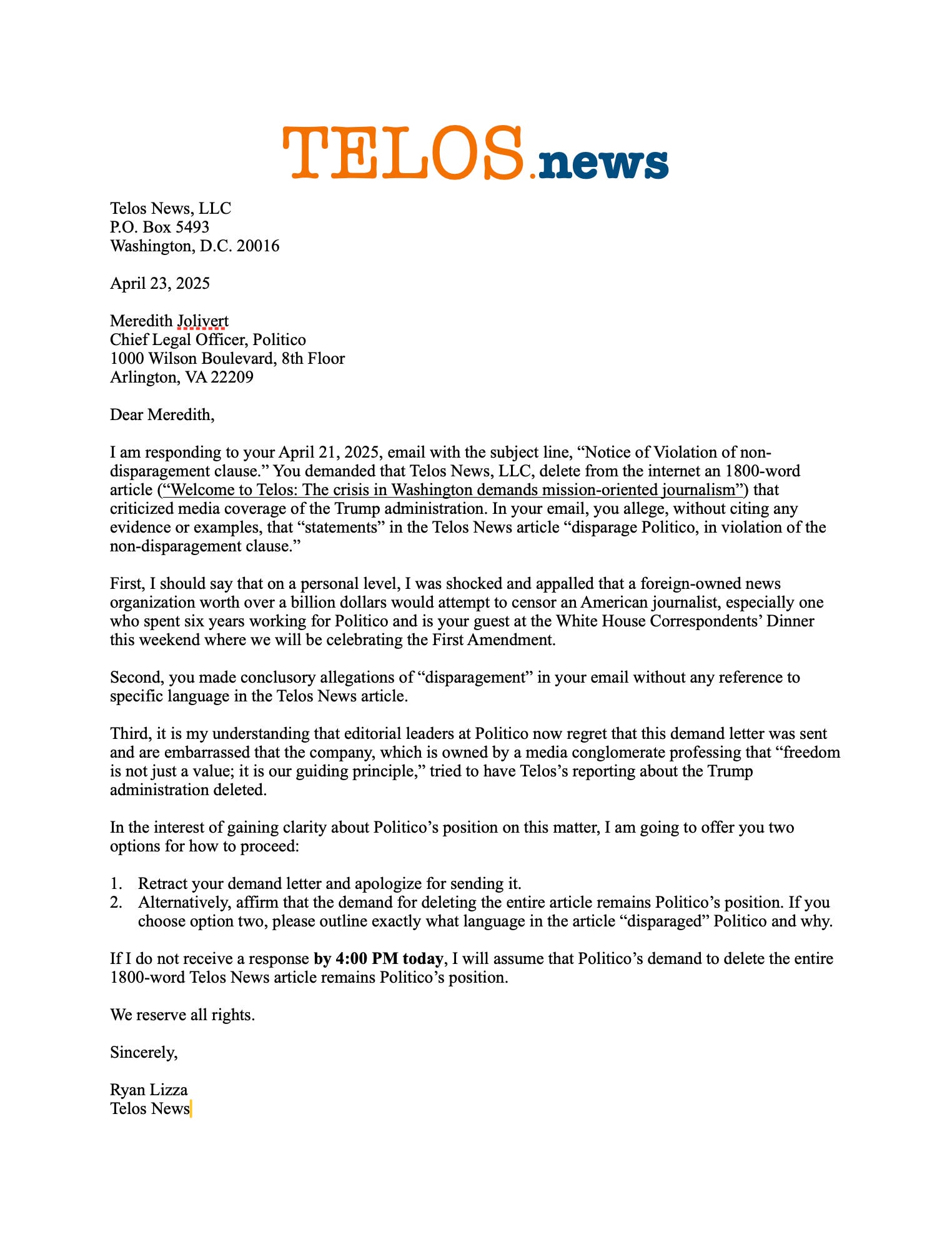 I wanted Telos subscribers to be the first to know of a new development in the ongoing fight with Politico, which demanded that I delete an article critical of media coverage of Donald Trump.